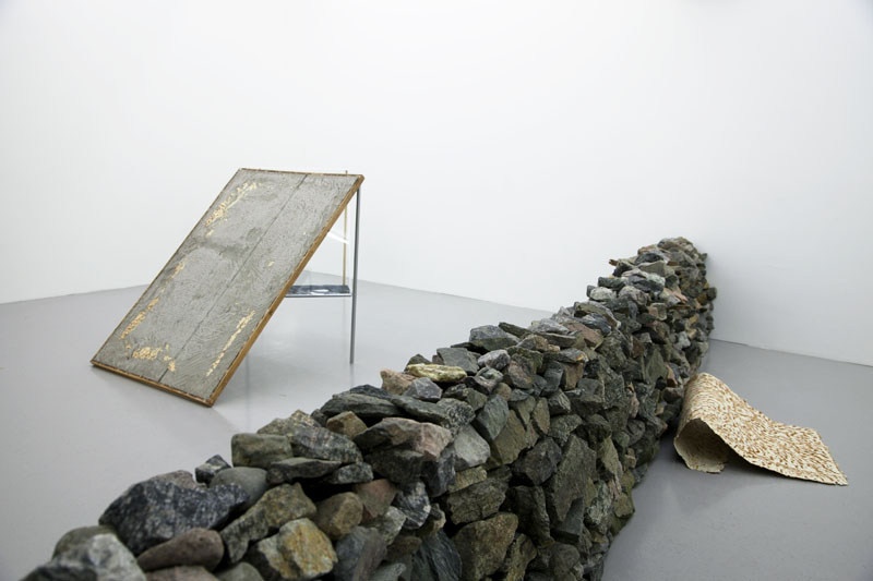 In the exhibition Stone Cold at Tag Team they conduct a site-specific installation where physically demanding actions lead to a mutual structure that defines the venue and where the coherence of the work in construction is contrary to the misanthropic importance of building boundaries. In the exhibition their own sculptural and photographic works interact with each other and throw into question the function and intention of the constructed barrier.